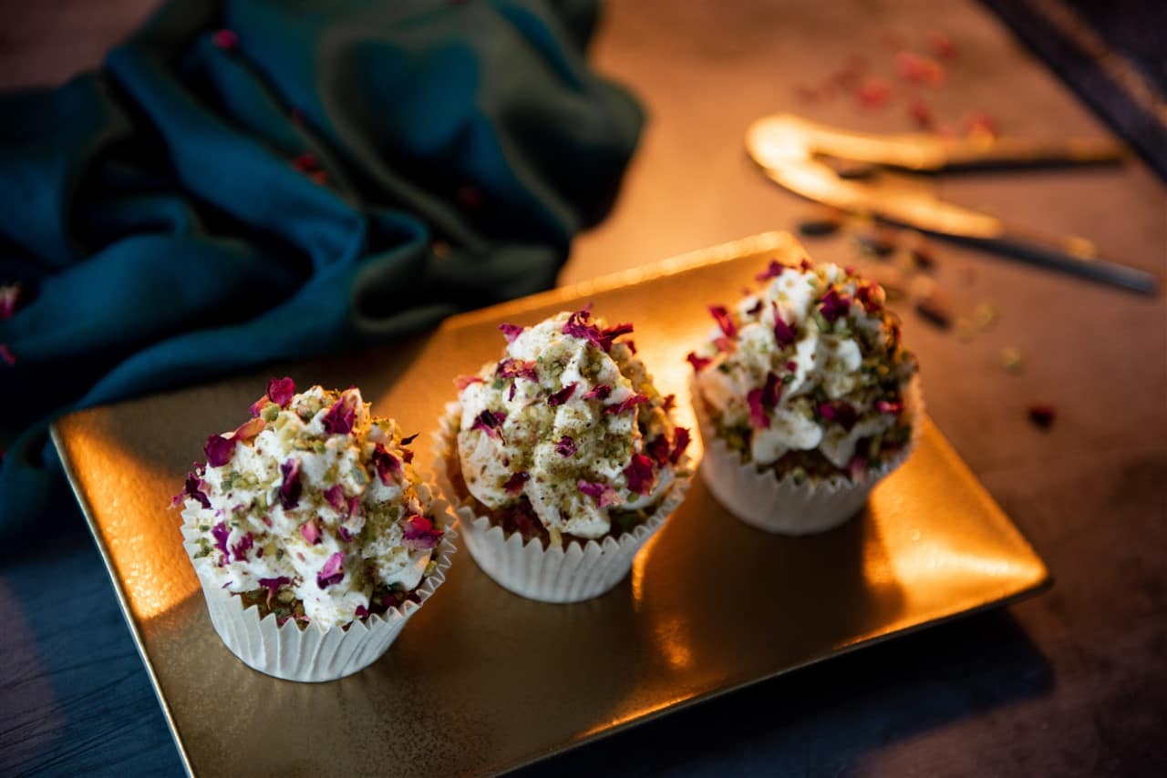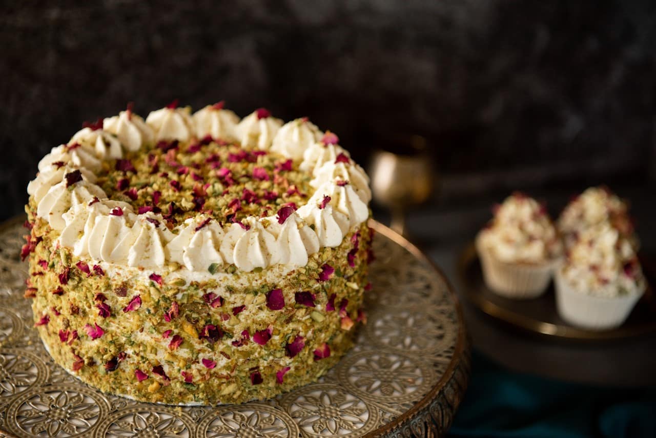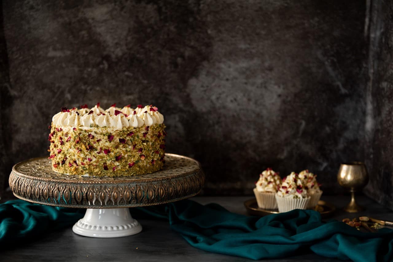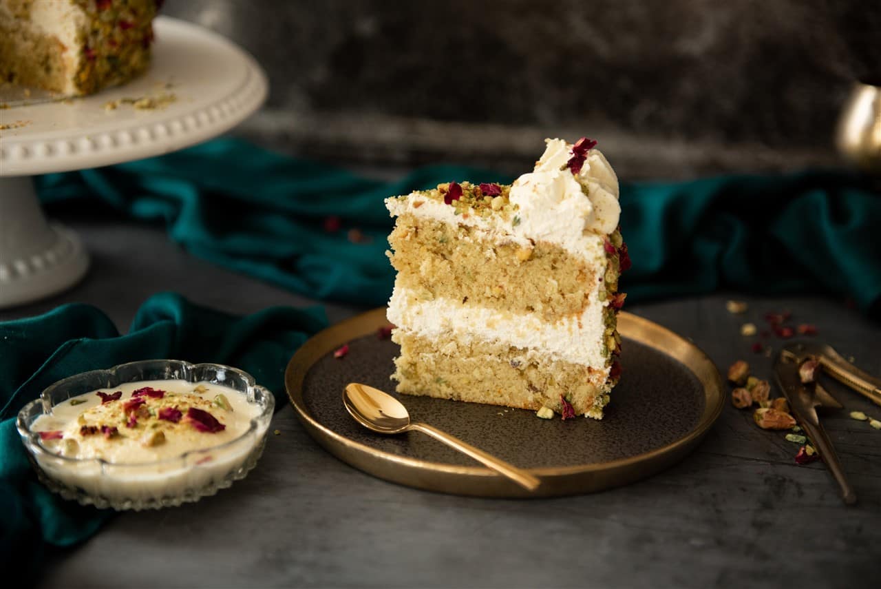 One helping of this luscious dessert is never enough and you can’t help but go back for seconds, just like my Ras Malai inspired cake! It’s soft, decadent, full of flavour, encased with a cardamom cream topped with pistachios and edible rose petals making it a truly delectable delight!